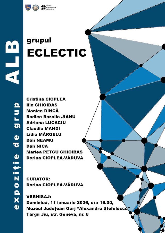 De la ora 16.00, la Muzeul Județean Gorj ”Alexandru Ștefulescu” din Târgu Jiu va avea loc vernisajul expoziției de arte vizuale ”Alb” a grupului ECLECTIC, format din artiștii Cristina CIOPLEA, Ilie CHIOIBAȘ, Monica DINCĂ, Rodica Rozalia JIANU, Adriana LUCACIU, Claudia MANDI, Lidia MĂRGELU, Dan NEAMU, Dan NICA, Mariea PETCU CHIOIBAȘ, Dorina CIOPLEA-VĂDUVA. Expoziția poate fi vizitată în perioada 11 ianuarie – 5 februarie 2026. Curator: Dorina Cioplea-Văduva.