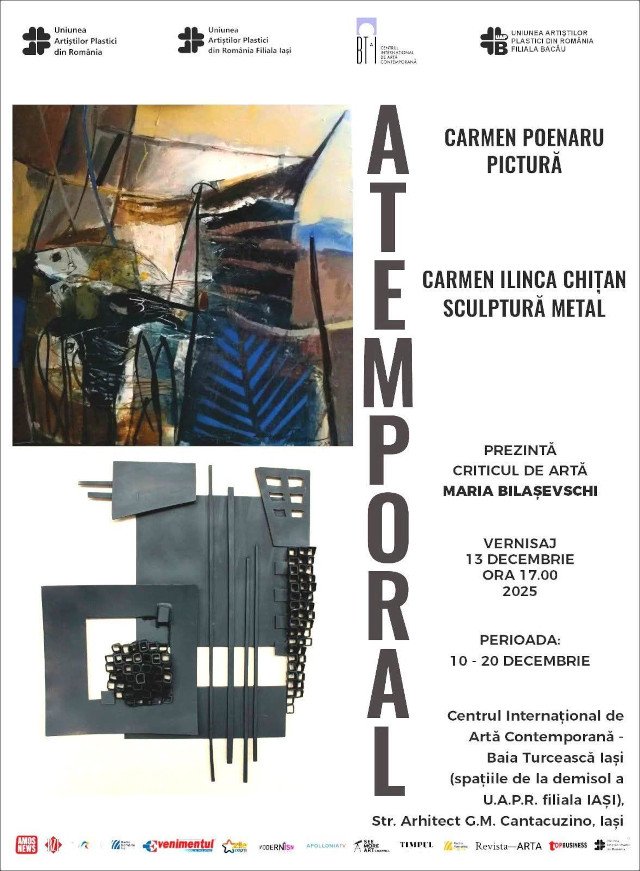 Pictorița Carmen Poenaru și sculptorița Carmen Chițan vă invită la deschiderea expoziției „ATEMPORAL”, un eveniment dedicat expresiilor artistice care depășesc limitele timpului. Vernisajul va avea loc în data de 13 decembrie 2025, ora 17, la Centrul Internațional de Artă Contemporană Baia Turcească din Iași.