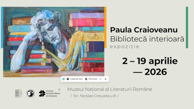Muzeul Național al Literaturii Române vă invită la expoziția de pictură „Bibliotecă interioară”, semnată de artista Paula Craioveanu. Vernisajul va avea loc joi, 2 aprilie 2026, ora 18.00, iar prezentarea expoziției va fi susținută de Loreta Popa. Evenimentul se desfășoară la sediul muzeului din Str. Nicolae Crețulescu nr. 8, București.