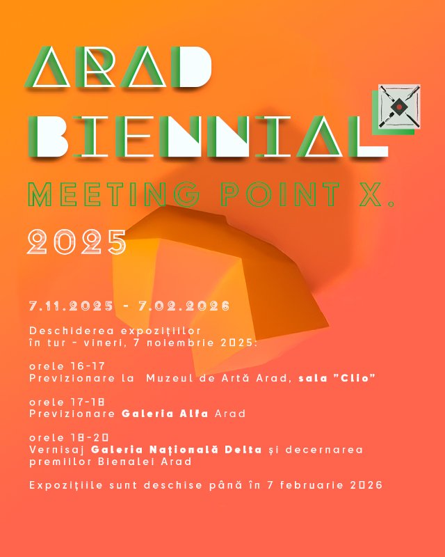 Suntem bucurosi să vă anunțăm că Bienala Arad Meeting Point 2025, ajunsă la a 10 a editie, organizată de Asociația ”Filiala Arad a Uniunii Artiștilor Plastici din România”, va avea loc în anul acesta la Galeria Natională Delta Arad, Galeria Alfa Arad și Muzeul de Artă Arad- sala „Clio„ din 7.11.2025 până în 7.02.2026 .