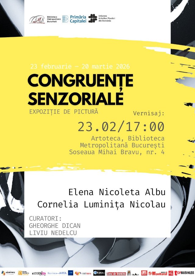 Biblioteca Metropolitană București are plăcerea de a anunța deschiderea expoziției de artă vizuală Congruențe senzoriale, semnată de artistele Elena Nicoleta Albu și Cornelia Luminița Nicolau.  Evenimentul va avea loc în perioada 23 februarie – 20 martie 2026 și va fi deschis publicului  în cadrul vernisajului de luni, 23 februarie, de la ora 17:00.
