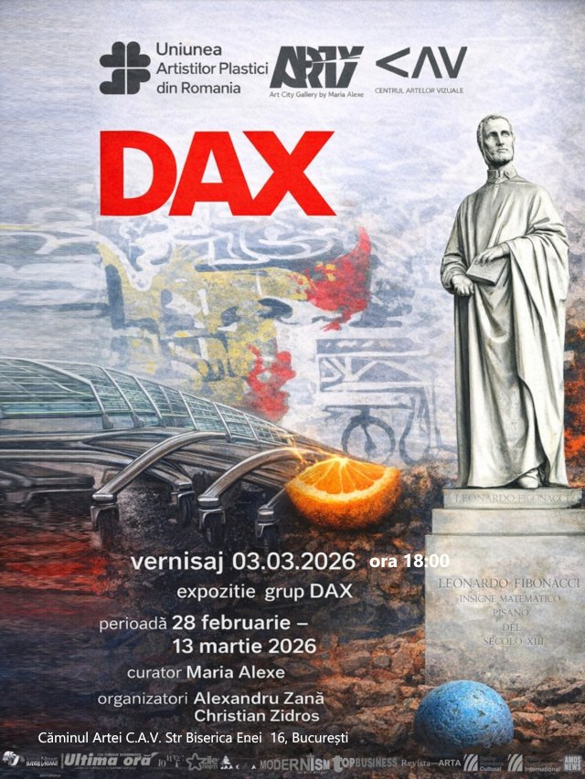 Marți 03 martie 2026 grupul DAX vă invită, începând cu ora 18:00, la vernisajul expoziției “DAX – FIBONACCI”, care reunește lucrări realizate în tehnici diverse și experimentale (pictură, grafică, sculptură, arte decorative, instalații, happening, digital print, fotografie) la Căminul Artei C.A.V. (Strada Biserica Enei nr.16 București) în spațiul expozițional de la etajul galeriei.