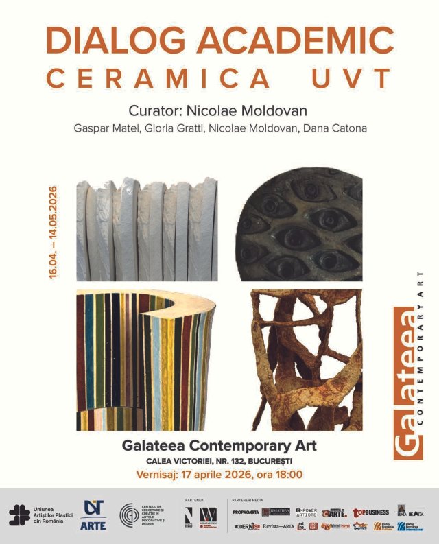 Galeria Galateea Contemporary Art vă invită vineri, 17 aprilie 2026, ora 17.00, la vernisajul expoziției, DIALOG ACADEMIC. CERAMICA UVT curatoriată de Nicolae Moldovan. Vernisajul va fi marcat de cuvântul de deschidere susținut de istoricul și criticul de artă Cristian-Robert Velescu.
