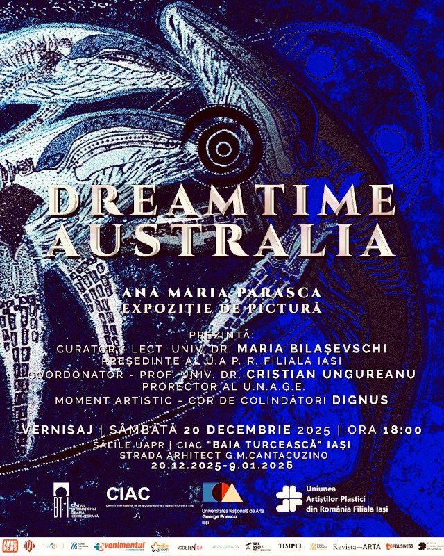 Uniunea Artiștilor Plastici din România Filiala Iași și Centrul Internațional de Artă Contemporană – Baia Turcească din Iași au plăcerea de a vă invita la expoziția de pictură intitulată „Dreamtime Australia ” semnată de artista ANA MARIA PARASCA