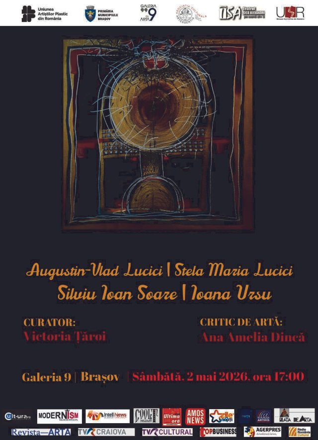Introspecția în lumea lăuntrică este cel ai frumos mod de confesiune și de redefinire a ființei. Patru artiști contemporani, cu viziuni identitare, își reevaluează raportul cu lumea intimă a gândurilor prin intermediul unui limbaj plastic coerent, pictura, grafica, colajul textil și fotografia, fiind genurile artistice prin care resorturile lor interioare stabilesc un dialog cu realitatea, un spațiu unde interogațiile își găsesc răspuns. Stela Maria Lucici, Augustin Vlad- Lucici, Ioana Ursu și Silviu-Ioan Soare expun la “Galeria9“ din Brașov o serie de lucrării în care culoarea și forma dau măsura unor direcții stilistice aparținând unui discurs postmodern, tratat diferit de fiecare dintre expozanți. Sâmbătă, 2 mai 2026, la ora 17,00 iubitorii de artă din Brașov sunt așteptați la deschiderea expoziției curatoriată de doamna Victoria Țăroi, președinte și fondator al Asociației Culturale “Artessentia“.