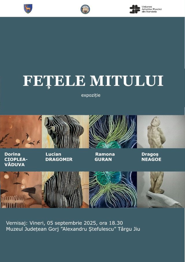 Vineri, 05 septembrie 2025, de la ora 18,30, la Muzeul Județean Gorj ”Aloexandru Ștefulescu” din Târgu Jiu va avea loc vernisajul expoziției de pictură și sculptură ”Fețele mitului”, care aduce pe simezele târgujiene artiștii Dorina Cioplea-Văduva, Lucian Dragomir, Ramona Guran și Dragoș Neagoe. Expoziția reunește lucrări de pictură și sculptură ce explorează miturile și interpretările lor contemporane.