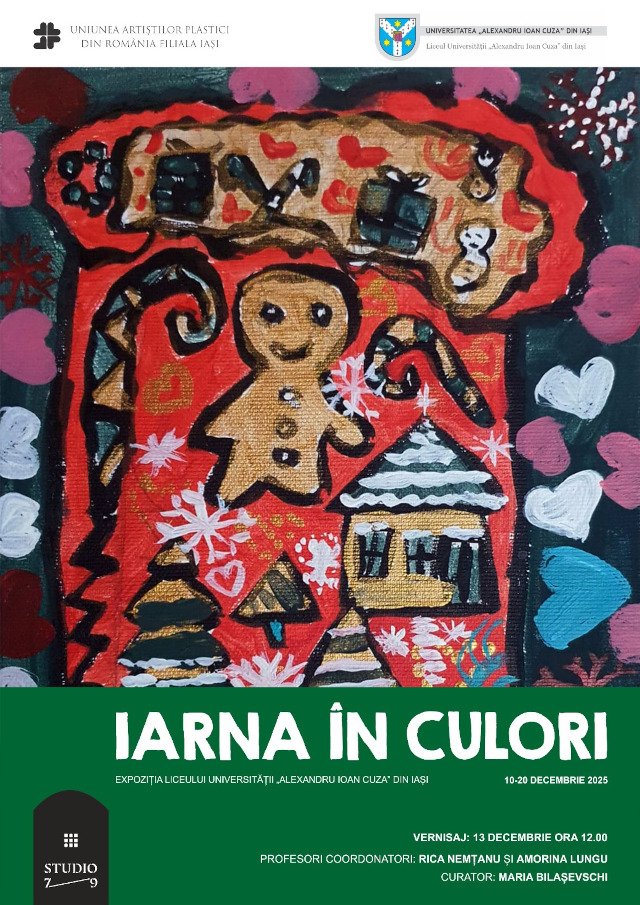 Uniunea Artiștilor Plastici din România Filiala Iași și Liceul Universității „Al. I. Cuza” din Iasi au plăcerea de a vă invita la expoziția intitulată „Iarna în culori”.