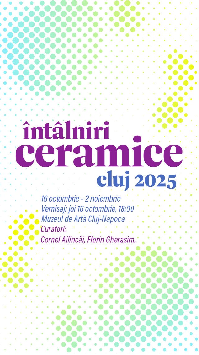 Expoziția „Întâlniri Ceramice la Cluj Napoca” reunește la Muzeului de Artă din Cluj-Napoca artiști ceramiști de prestigiu sau tinere talente din România într-un eveniment informal cu scopul de a promova și susține creația ceramiștilor români cât și de a păstra vie prezența artei ceramicii contemporane pe simezele muzeului clujean. Expoziția este organizată de un grup de artiști clujeni, cu sprijinul Fundației Ceramart, al Muzeului de Arta Cluj-Napoca și al Uniunii Artiștilor Plastici din România, grup care are o experiență vasta în organizarea de evenimente artistice naționale și internaționale incluzând numeroase ediții ale prestigioasei Bienale Internaționale de Ceramică Cluj. Evenimentul mai este susținut de: Consiliul Județean Cluj, Universitatea de Arta și Design Cluj, TVR Cluj, Radio România Cluj, Modernism.ro, Revista Arta, Amos News. Detalii Eveniment • Locație: Muzeul de Artă Cluj-Napoca (în cele două spații expoziționale de la parter). Piața Unirii 30, deschis miercuri-duminica între 10:00 – 17:00. • Durată: 16 octombrie – 2 noiembrie 2025. • Vernisaj: Joi, 16 octombrie, ora 18:00. • Curatori: Cornel Ailincăi, Florin Gherasim. Participanti Adela Bonat, Adina Jurca, Ágnes Forró, Alina Tudor, Anca Vintilă Dragu, Andrei Alupoaie, Andrei Florian, Aniela Ovadiuc, Arina Ailincăi,Árpád Agoston, Corneliu Ailincăi, Cristina Popescu Russu, David Leonid Olteanu, Decebal Țăroi, Doina Stici, Elena Amariei, Ernő Palkó, Felix Peter, Gavril Zmicală, Gheorghe Crăciun, Gloria Grati, Grigore Roibu, Ileana Crăciun, Iordanca Cioti, Judit Crăciun, Iulia Dancila, Iulian Vîrtopeanu, Koncz-Münich András, Lucia Lobonț, Mana Bucur, Maria Cioată, Marta Jakobovics, Melinda Kiss, Nicolae Moldovan, Nicolae Procopan, Noemi JiancoSezep, Oriana Pelladi, Ovidiu Ionescu, Simona Kolozsi, Stefan Szabo, Tudor Oltean, Vasile Cătărău, Vlad Basarab.