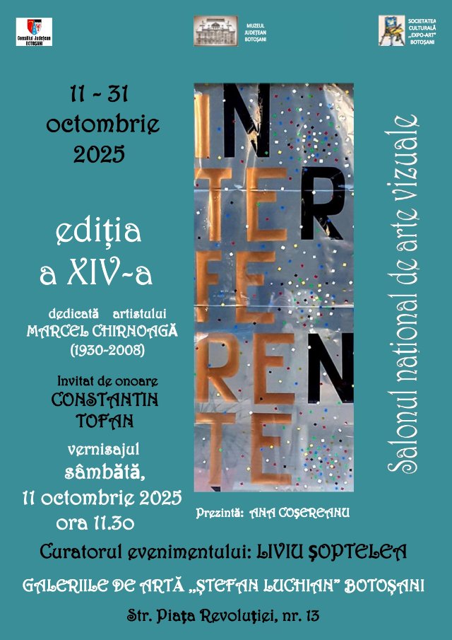 Muzeul Județean Botoșani găzduiește, în perioada 11-31 octombrie 2025, în spațiul Galeriilor de Artă „Ștefan Luchian” Botoșani, Salonul Național de Arte Vizuale „Interferențe”, ediția a XIV-a.