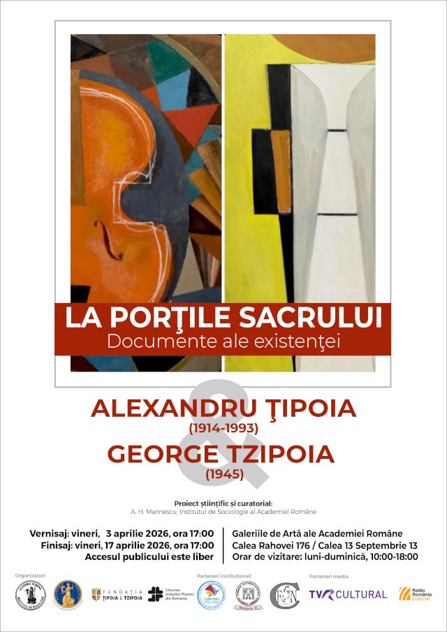Academia Română, prin Institutul de Sociologie și Casa Oamenilor de Știință, în parteneriat cu Fundația Țipoia & Tzipoia și cu Uniunea Artiștilor Plastici din România, vă invită la expoziția de artă modernă și contemporană românească „La porțile sacrului. Documente ale existenței” dedicată artiștilor plastici Alexandru Țipoia (1914-1993) și George Tzipoia (1945). Expoziția se înscrie în seria evenimentelor dedicate împlinirii a 160 de ani de la fondarea Academiei Române, și rămâne deschisă în perioada 3 aprilie – 20 aprilie 2026.