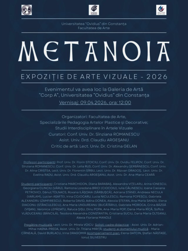 𝑭𝒂𝒄𝒖𝒍𝒕𝒂𝒕𝒆𝒂 𝒅𝒆 𝑨𝒓𝒕𝒆 a Universității „Ovidius” din Constanța organizează joi, 𝟗 𝐚𝐩𝐫𝐢𝐥𝐢𝐞 𝟐𝟎𝟐𝟔, de la ora 𝟏𝟐.𝟎𝟎, vernisajul expoziției „𝐌𝐞𝐭𝐚𝐧𝐨𝐢𝐚”, eveniment care va avea loc la Galeria de Artă „Corp A” a universității constănțene.