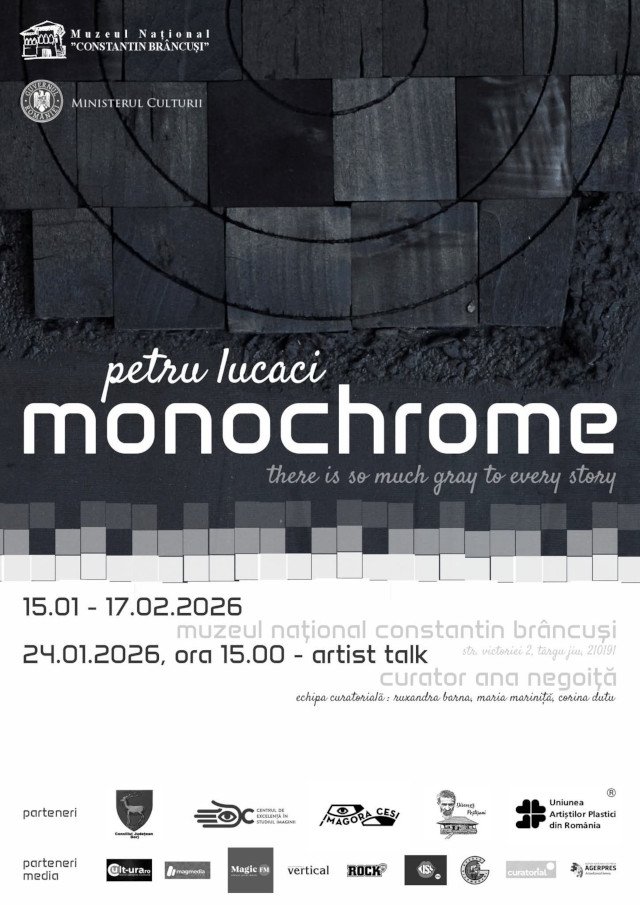 Expoziția ”Monochrome. There is so much grey to every story”, alcătuită din lucrări semnate de artistul Petru Lucaci, deschide la Muzeul Național ”Constantin Brâncuși” un amplu program de evenimentele cultural-artistice menite să marcheze Anul ”Constantin Brâncuși” – demers de profundă semnificație culturală, prin care este reafirmată importanța operei și a personalității lui Constantin Brâncuși în patrimoniul cultural național și universal. Brâncuși, supranumit ”părintele sculpturii moderne”, nu este doar un reper al artei moderne, ci un simbol al valorilor culturale care definesc identitatea noastră. Anul Brâncuși creează un nou cadru de reflecție, motiv pentru care Muzeul Național ”Constantin Brâncuși” are programate în 2026, numeroase proiecte culturale, educaționale și expoziționale, unele de anvergură internațională, evenimente culturale menite să valorifice moștenirea brâncușiană, să stimuleze cercetarea și să apropie publicul larg de valorile culturale.”, Denisa Șuță, manager Muzeul Național ”Constantin Brâncuși”.