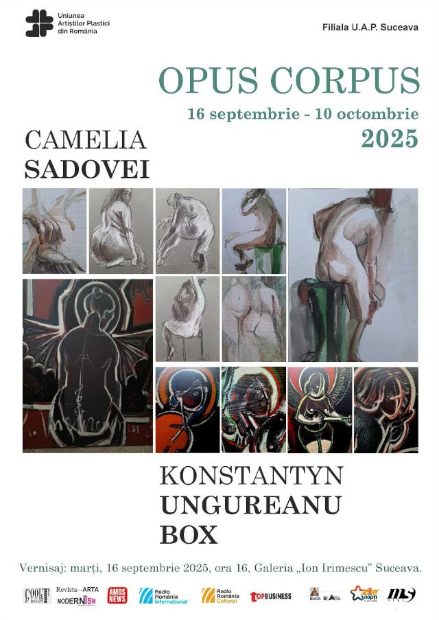 Marti, 16 septembrie, la Galeria „Ion Irimescu” din Suceava, va avea loc de la ora 16 vernisajul expoziției „Opus Corpus”. Expun pictorii Camelia Sadovei și Konstantyn Ungureanu Box