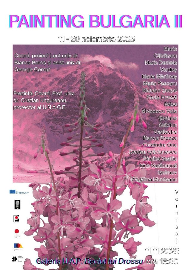 Avem plăcerea de a vă invita la deschiderea expoziției „Painting Bulgaria II”, care va avea loc mâine, 11.11.2015, ora 18.00, la galeria ”Beciul lui Drossu” a UAP Romania – Filiala Iasi, Str Lapusneanu, nr 7/9. Expoziția reunește lucrările realizate de studenți ai programelor Pictură și Painting Fine Arts din cadrul Facultatii de Arte Vizuale si Design – UNAGE Iasi, realizate în aug 2025, în urma mobilităților academice derulate prin programul Erasmus+ în Bulgaria. Coordonatori: Lect.univ.dr. Bianca Boroş , Asist.univ.dr. George Cernat. Prezintă: Prof.univ.dr. Cristian N. Ungureanu, prorector al Universității Naționale de Arte „George Enescu” din Iași.