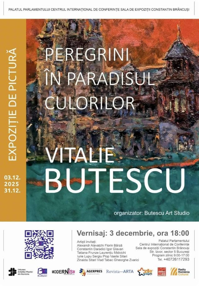 Miercuri, 3 decembrie, la ora 18, la Centrul Internațional Brâncuși al Palatului Parlamentului va avea loc vernisajul expoziției „Peregrini în paradisul culorilor” . Protagonist este pictorul Vitalie Butescu .
