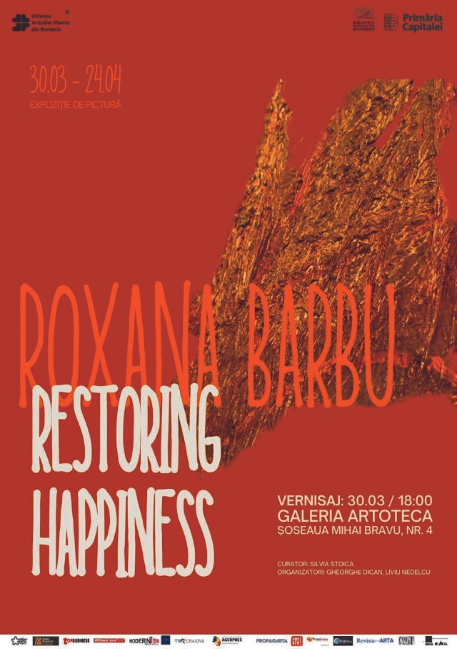 Galeria „ARTOTECA” a Bibliotecii Metropolitane București va găzdui, de la ora 18, vernisajul expoziției „Restoring Happiness” cu lucrări semnate de pictorița Roxana Barbu. Curatoare este Silvia Stoica. Organizatori: Gheorghe Dican și Liviu Nedelcu.