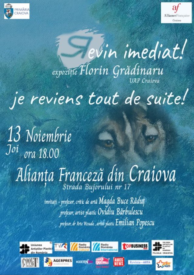 La Alliance Francaise de Craiova, artistul plastic Florin Grădinaru, în colaborare cu Alianța Franceză din Craiova, organizează joi, 13 noiembrie, vernisajul expoziţiei personale ,,Revin imediat!’’. Evenimentul se desfăşoară la sediul Alianței Franceze, strada Bujorului nr 17, începând cu ora 18.00, avându-i ca invitați pe artis plastic Prof. Ovidiu Bărbulescu, Critic de artă, Prof. Magda Buce Răduț, Prof. Dr. în Arte Vizuale Emilian Popescu. Expoziţia conţine lucrări în majoritate pastel pe pânză, reprezentând peisaje, compoziţii, portete şi naturi statice. Florin Grădinaru este membru stagiar al Uniunii Artiştilor Plastici din România, filiala Craiova. A expus în mai multe oraşe precum Timişoara, Ploieşti, Cluj, Târgu Mureş, Tulcea etc. În ultimii ani, s-a implicat de asemenea în activităţi sociale şi educaţional-artistice, precum ateliere de pictură adresate persoanelor vârstnice din cadrul Centrului social ,,Sfinţii Doctori Cosma şi Damian’’ al Arhiepiscopiei Craiovei şi atelier de pictură în aer liber, organizat în Parcul ,,Sfântul Dumitru’’ din Craiova.
