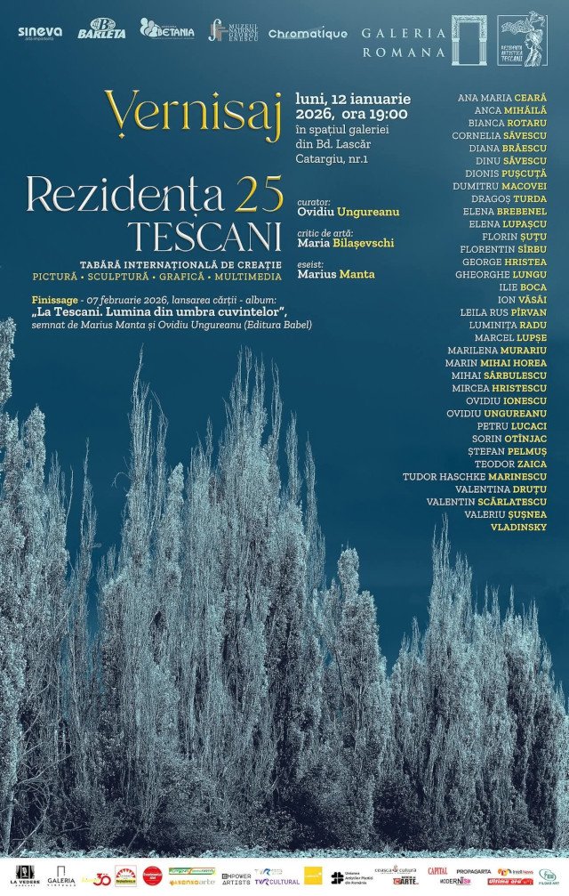 Galeria Romană are plăcerea de a vă invita la vernisajul expoziției Rezidența Tescani 2025, luni, 12 ianuarie 2026, începând cu ora 19:00, în spațiul galeriei din Bd. Lascăr Catargiu, nr.1, sector 1, București.