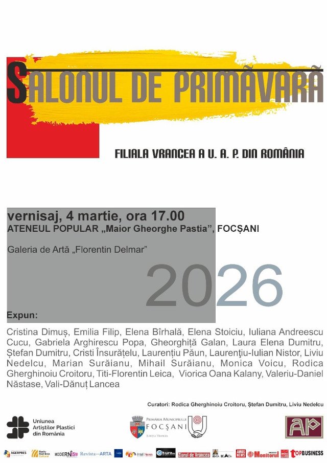 Filiala Vrancea a Uniunii Artiștilor Plastici din România și Teatrul Mr. Gh. Pastia al Municipiului Focșani, sub egida Primăriei Municipiului Focșani, organizează miercuri, 4 martie 2026, de la ora 17.00, la Ateneul Popular Maior Gheorghe Pastia, Sala Florentin Delmar, Salonul de Primăvară al Filialei Vrancea a Uniunii Artiștilor Plastici din România, expoziție de artă vizuală dedicată mărțișorului.