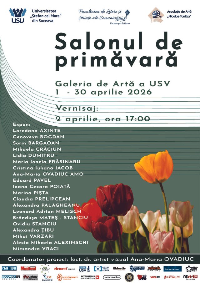 Asociaţia de Artă „Nicolae Tonitza” din cadrul Universităţii „Ştefan cel Mare” din Suceava , organizează joi, 2 aprilie, 2026, ora 17:00, în Galeria de Artă a USV, vernisajul expoziției „Salonul de primăvară”.