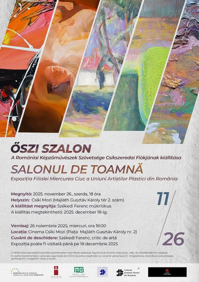 Miercuri, 26 noiembrie 2025, la ora 18:00, va fi vernisat Salonul de toamnă al artiștilor din filiala Miercurea Ciuc a Uniunii Artiștilor Plastici din România. Evenimentul va fi găzduit de galeria de la etajul Cinematografului „Csíki Mozi”.