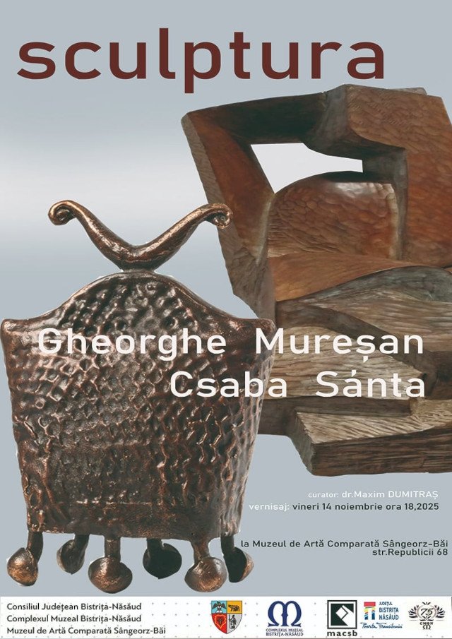Complexul Muzeal Bistrița-Năsăud vă invită cu drag la vernisajul expoziției de sculptură în bronz semnată de artiștii Gheorghe Mureșan și Sánta Csaba – două voci distincte ale sculpturii transilvănene contemporane, unite printr-o profunzime comună a privirii asupra materiei și a timpului.