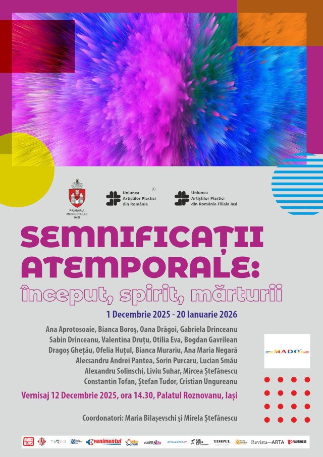 Uniunea Artiștilor Plastici din România – Filiala Iași împreună cu Primăria Municipiului Iași au plăcerea de a vă invita la expoziția intitulată „SEMNIFICAȚII ATEMPORALE: început, spirit, mărturii” organizată pentru a celebra spiritul, istoria și viitorul artistic și cultural al orașului Iași.