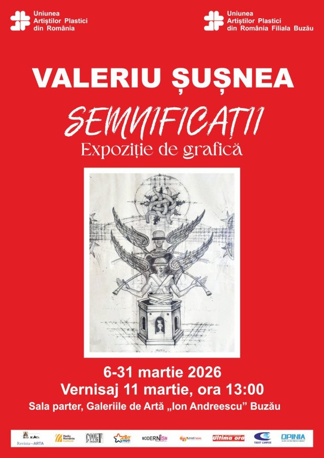 La Galeriile „Ion Andreescu” din Buzău, în perioada 6-31 martie, este prezentată expoziția de grafică „Semnificații” a artistului Valeriu Șușnea. Vernisajul cva avea loc miercuri, 11 martie, la ora 13.