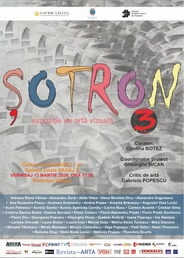 Filiala Râmnicu Vâlcea a Uniunii Artiștilor Plastici din România, în parteneriat cu Primăria Municipiului Râmnicu Vâlcea și cu Uniunea Artiștilor Plastici din România, organizează în data de vineri, 13 martie 2026, la ora 17ꓽ00, în Galeriile Cozia Pasaj, cea de-a treia ediție a expoziției de grup „ȘOTRON”, cu participarea membrilor Filialei Râmnicu Vâlcea a Uniunii Artiștilor Plastici din România și a invitaților din țară. Curatorꓽ Cristina Bacicu Botez