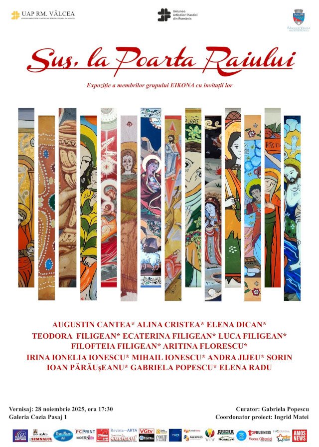 Filiala Râmnicu Vâlcea a UAP din România, în parteneriat cu Primăria Municipiului Râmnicu Vâlcea și cu Uniunea Artiștilor Plastici din România, organizează în data de 28 noiembrie 2025 la ora 17,30, în Galeria Cozia Pasaj 1, vernisajul expoziției „Sus, la Poarta Raiului”, a Grupului Eikona și a invitaților lor.