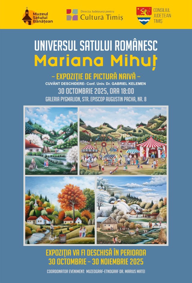 Vă invităm joi, 30 octombrie 2025, ora 18:00, la vernisajul expoziției de pictură naivă „Universul Satului Românesc – Mariana Mihuț”,