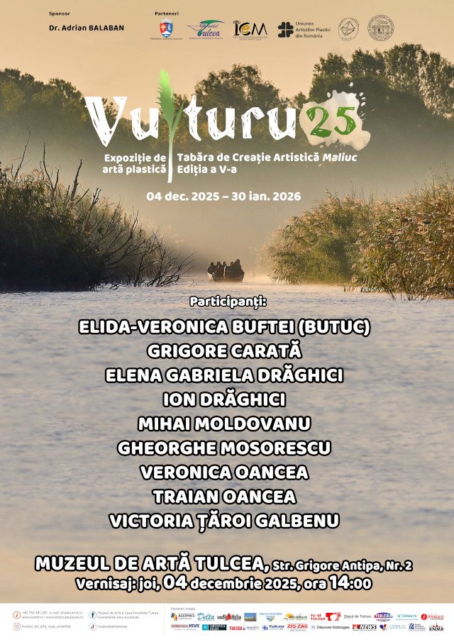 Complexul Muzeal de Patrimoniu Cultural Nord Dobrogean al Institutului de Cercetări Eco-Muzeale „Gavrilă Simion” Tulcea, Uniunea Artiștilor Plastici din România (Filiala București și Filiala Tulcea) și Dr. Adrian Balaban vă invită în perioada 4 decembrie 2025 – 30 ianuarie 2026 să vizitați expoziția colectivă de artă plastică intitulată „Vulturu 25”.